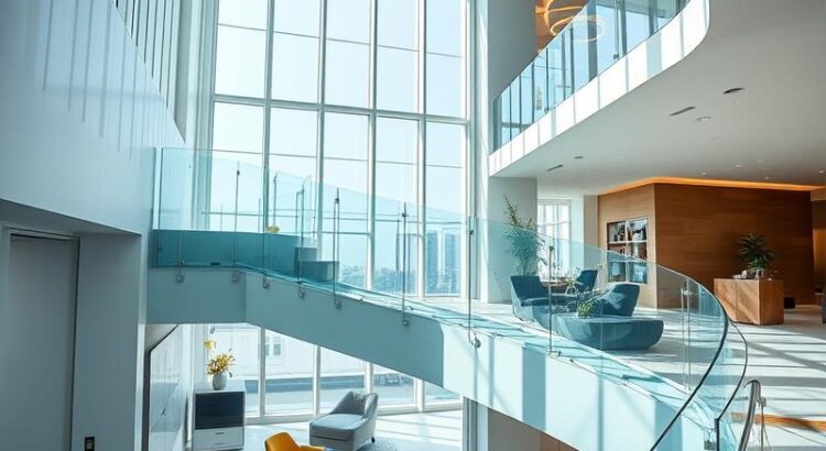 W przestrzeniach publicznych, takich jak biura, centra handlowe czy obiekty usługowe, balustrady szklane: